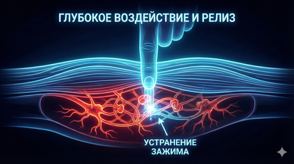 Далее проводится ручная работа с глубокими слоями тканей и миофасциальными спайками.
